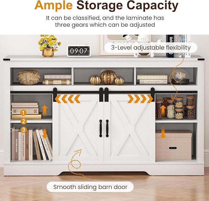 - Maximize Storage with Our Fireplace TV Stand: The overall size is 58" W x 34" H x 16"D. The spacious tabletop holds it all, while 3 top-tier compartments keep things organized. Adjustable shelves on both sides offer 3 height options for different-sized items. Neatly tuck wire away through discreet holes.