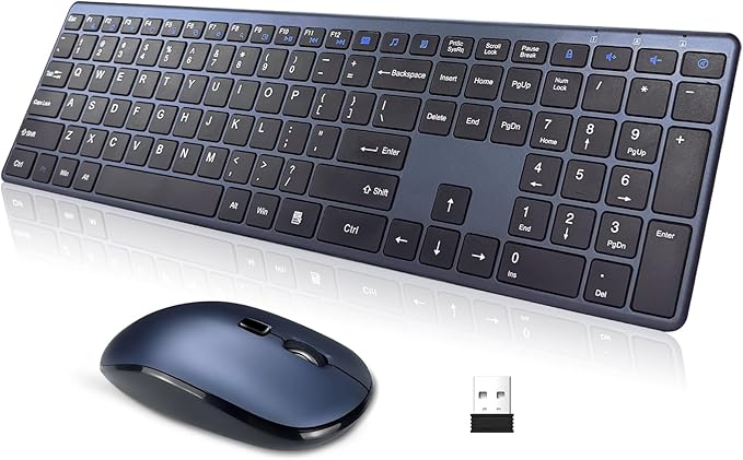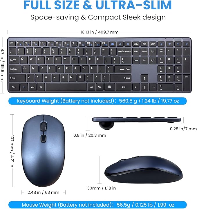 - 【Space-Saving Full-Size & Quiet Wireless Keyboard Mouse】This ultra-slim, compact wireless keyboard designed with short-throw, laptop-style keys, offers a full standard layout with dedicated arrow keys, number pad, and customizable shortcuts, providing a comfortable and efficient typing experience in a sleek, its innovative noiseless click technology reduces noise by up to 90%, ensuring a quiet and distraction-free work environment. Space-saving design perfect for both home, office, and Shared Spaces.