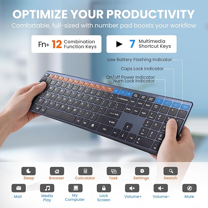 - 【19 Multimedia Shortcuts & Efficient Layout】Boost productivity with 12 multimedia shortcut keys and a full numeric keypad for easy data entry. Fully compatible with Windows systems, this USB wireless keyboard also offers 7 additional shortcuts (Note: some may not be compatible with Mac). Perfect for both work and play, this versatile keyboard lets you access your most-used functions with a single touch.