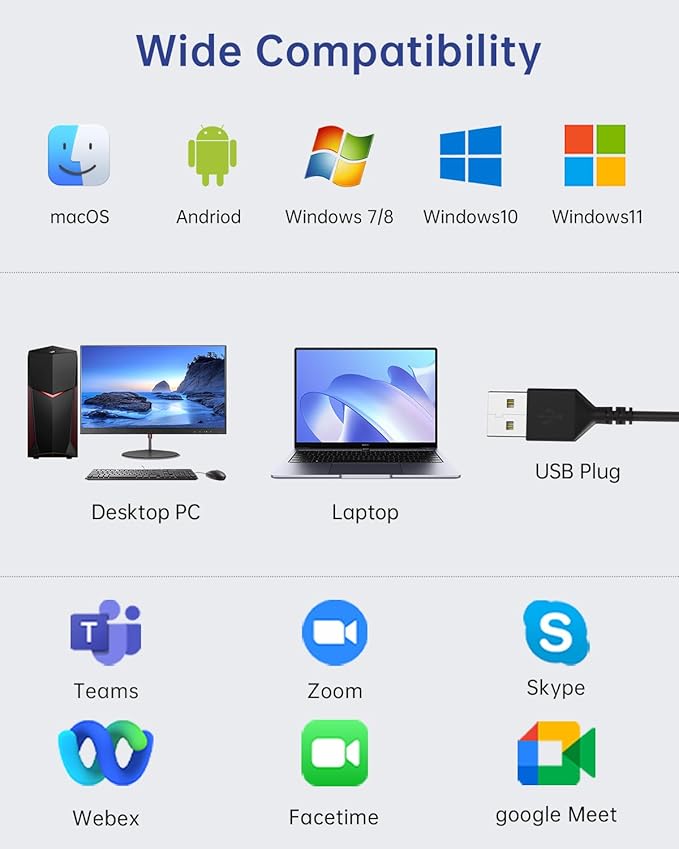 - 【Wide Range of Uses】The headphones with mic is compatible with popular software like Teams, Skype, Zoom, and Webex. Perfect for online courses, webinars, call centers, offices, teleconferencing, remote work, and gaming, it creates a convenient and efficient online bridge for effective communication