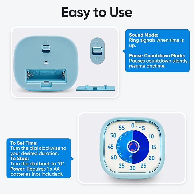- Time Management: Whether you're using it as a daily routine timer, school desk timer, Pomodoro work tool, or classroom visual aid, the durable, compact timer adapts to your routine. The calm blue tone complements any space without overwhelming the senses