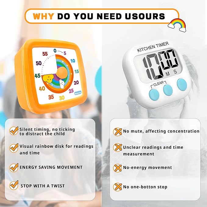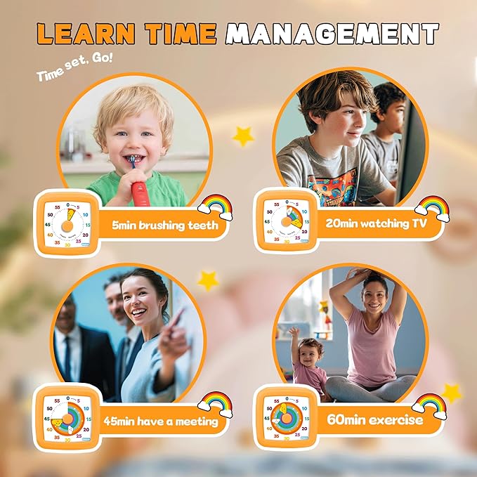 - Vibrant Visual Time Management for All Ages. Watch the captivating rainbow disk shrink, making abstract time tangible and easy to understand. This intuitive visual aid is indispensable for teaching kids time awareness, helping individuals with ADHD and autism transition between tasks, and keeping everyone from toddlers to seniors calmly focused.