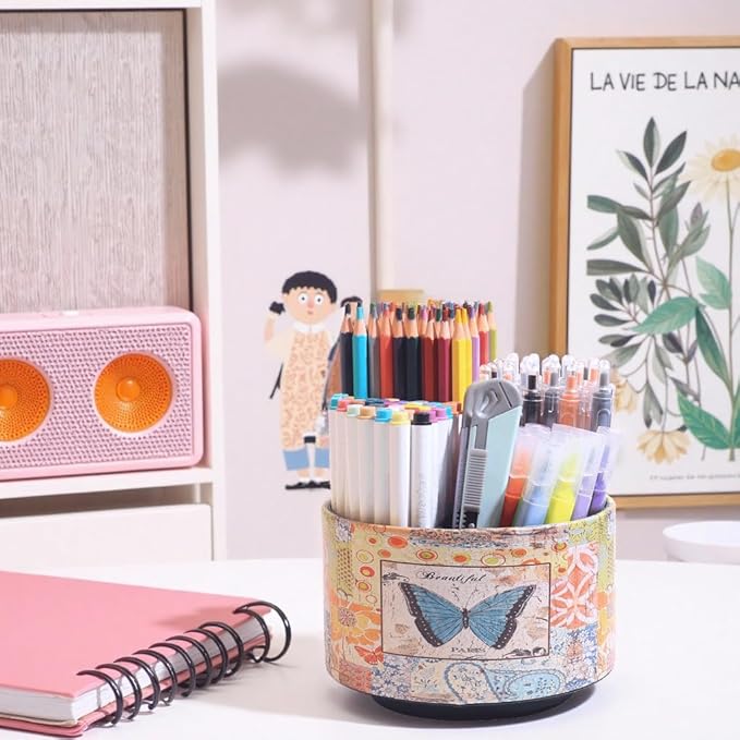 360° Rotate Desk Pen Organizer, Makeup Brush Holder Organizer, Makeup Organizers Countertop, TV Remote Control Holder,Leather Remote Caddy,Dual-Purpose Art Supply Pencil Cup (Blue Butterfly)