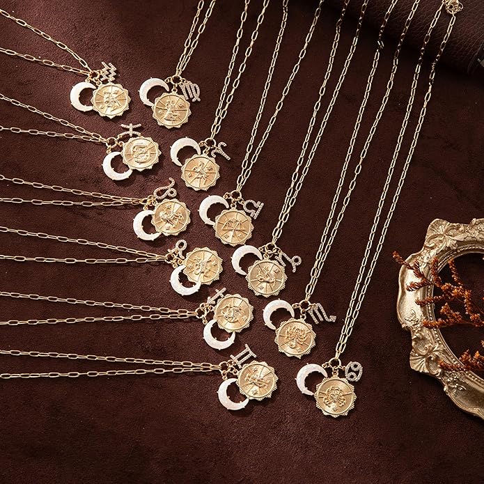 - PREMIUM MATERIAL & ADJUSTABLE SIZE: Crafted in high-quality brass with opalite Crescent Moon Charm, 5A Cubic Zirconia Zodiac Charm and Embrossed Constellation Coin. Hypoallergenic 18K Real gold-plated; 21mm coin pendant; 18''+2.5'' adjustable chain size