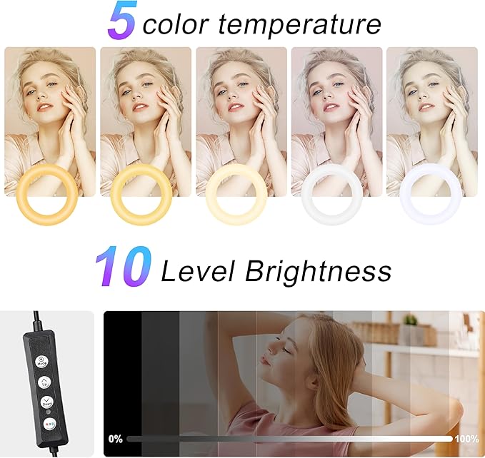- Diverse Application:Great led ring light for daily work and life. You can use your phone holder to shoot on a table or use the adjustment tripod to shoot from a distance. Ideal for a makeup tutorial, perfect for product photography, video calls and conferences, social media content, live streaming selfie, make-up, YouTube, TikTok photo shooting, etc