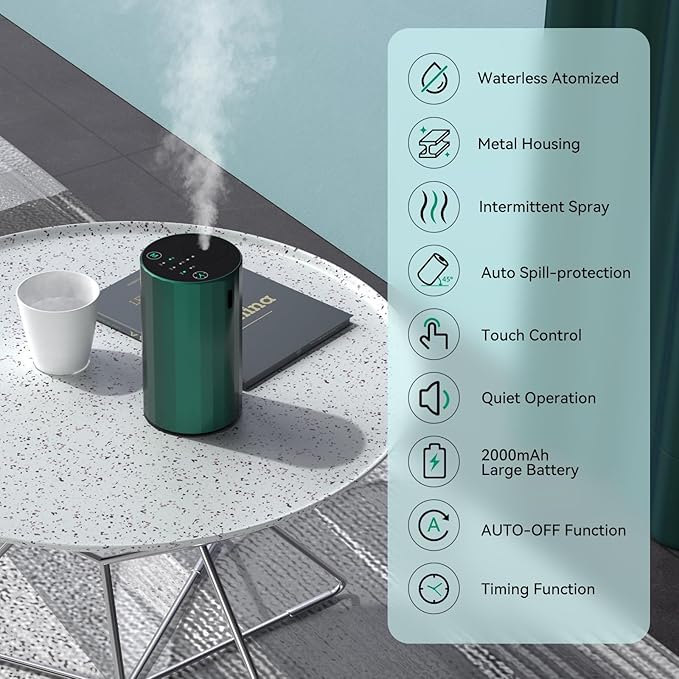 Waterless Essential Oil Diffuser Aromatherapy Scent Diffusers for Home Large Room, Bedroom, Car, Office, Desk, Battery Operated Mini Portable Air Freshener (Green)