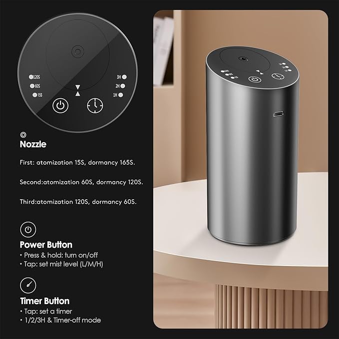 - Adjustable Woking Modes & Timing: Waterless car diffuser features 3 levels adjustable scent modes. Mode 1: Spray 15 seconds every 3 minutes. Mode 2: Spray 60 seconds every 3 minutes. Mode 3: Spray 120 seconds every 3 minutes. And it is designed with 4 levels timing, 1H/2H/3H/4H. Allowing you control the scent grades and timing, and customize the best aromatherapy experience.