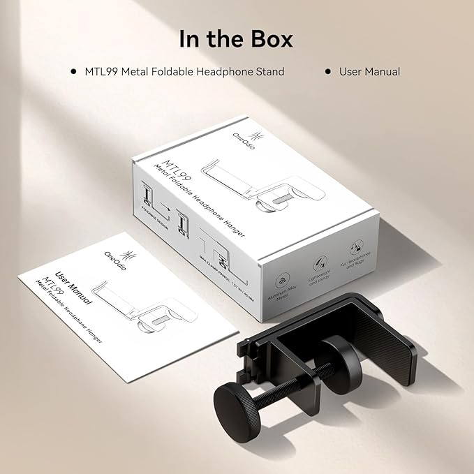 OneOdio MTL99 Foldable Headphone Stand, Metal Headset Holder Space-Saving Table Hook, Clamp-on Under Desk Hanger, Universal Fit Gaming Headphones Mount, Black