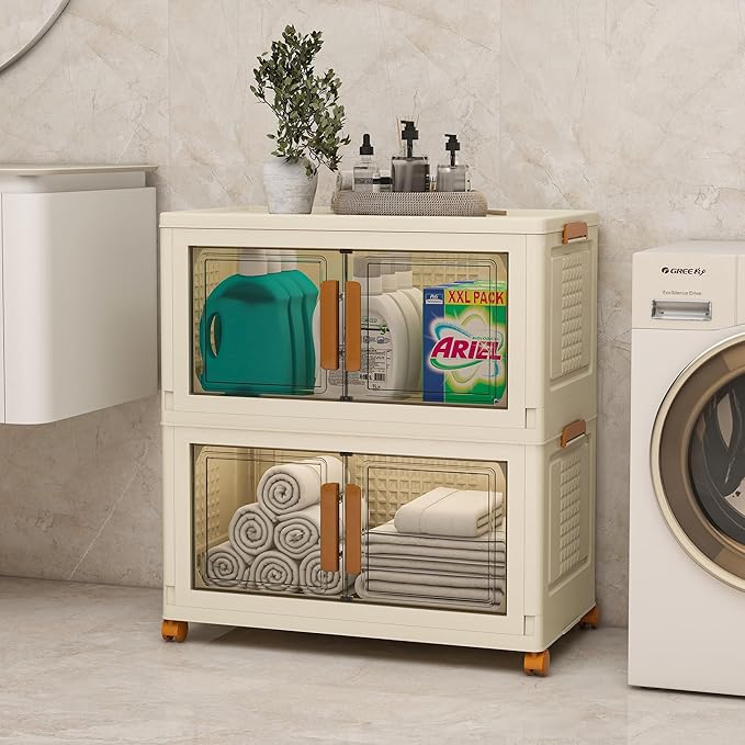 - ELEGANT DESIGN: The storage bins's front door is transparent, allowing easy access to the contents. Each door is equipped with a handle, and the storage bin boasts a stylish and minimalist appearance, fitting seamlessly with various furniture. The foldable storage box can be stacked according to your needs, equipped with a lid at the top, and four movable wheels are built into the bottom, facilitating easy movement as required.