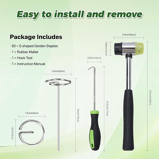 - 【Complete Set】The sharp end of the ground stakes easily penetrates landscape fabric or artificial turf and effectively prevents damage during installation and removal, while the wide top allows quick, effortless insertion with a rubber mallet and easy extraction using a removal hook.