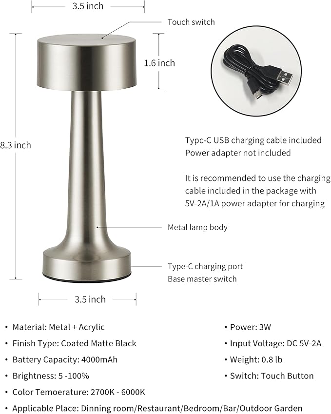 - Metal Material: The body is constructed from metal with a baked enamel coating to guard against scratches and corrosion. The gold/silver color models feature an electroplated surface treatment, offering both smooth and textured finishes. The lampshade is crafted from acrylic, allowing good light transmission that is not blinding and gentle on your eyes. The base has non-slip pads to avoid unintentional tipping. Besides being intended for indoor use, it is also appropriate for outdoor activities and camping.