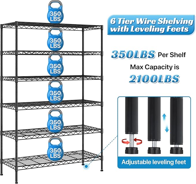 - 【HEAVY LOADING CAPACITY】: Heavy Duty Shelving with Leveling Feet - per shelf can hold 350 lbs (evenly distributed), maximum load capacity is 2100 lbs. wire shelving with wheels - per shelf can hold 85 lbs (evenly distributed), maximum load capacity is 510 lbs. We recommend placing heavy items on the bottom shelf for maximum stability.