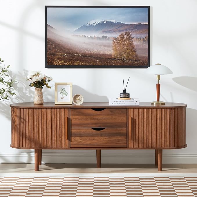 - 【Multi-functional Console Table】 This media console with drawers instantly upgrades any home decor style with its fluted finish, a curved edges, and wood grain. The simple and elegant design perfectly matches various furniture styles. It is not only a TV stand, but also can be used as a storage cabinet, entertainment centre. It is perfect for living room, bedroom, apartment. office, etc.
