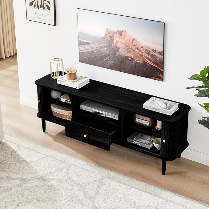 - 【Multi-purpose TV Stand】 This media console with drawer instantly upgrades any home decor style with its fluted finish, curved edges, and wood grain. The simple and elegant design perfectly matches various furniture styles. It is not only a TV stand, but also can be used as a storage cabinet, entertainment centre. It is perfect for living room, bedroom, apartment. office, etc.