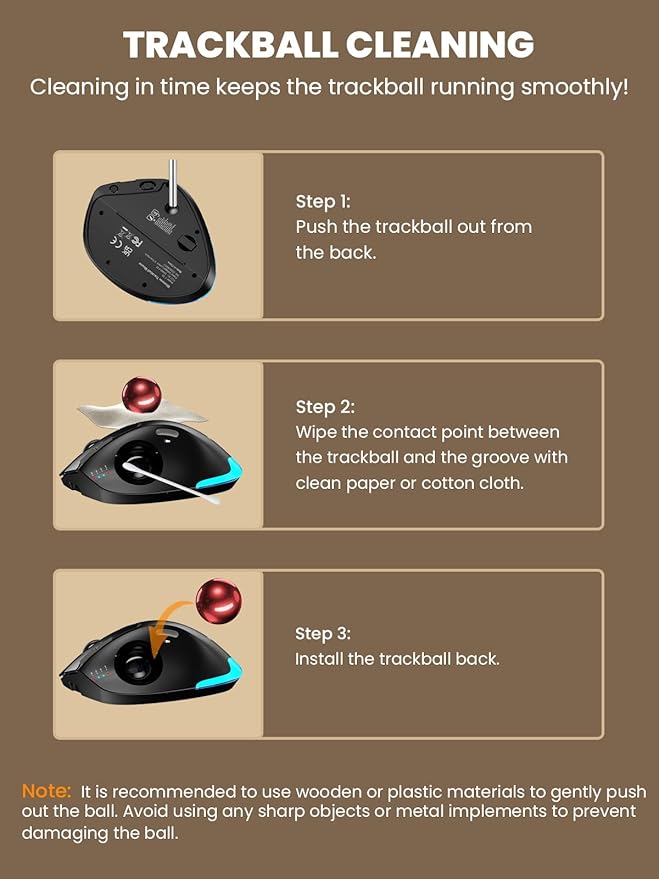 - Warm Tips: If you are using a trackball mouse for the first time, it may take some time to get used to its operation. We recommend that you spend 1-2 weeks to adapt, as many users find that this helps reduce the pressure and pain on the wrist caused by long-term use of the mouse and improves comfort
