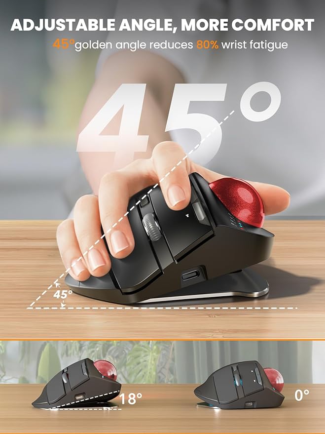 - Ergonomic design: You can choose the trackball mouse angle that suits you according to your needs, 0° and 18°. Proven: The 18° design is more in line with the natural drooping wrist angle of sitting posture, especially for people who use computer mouse for a long time, giving you a more comfortable experience and Reduces Muscle Strain