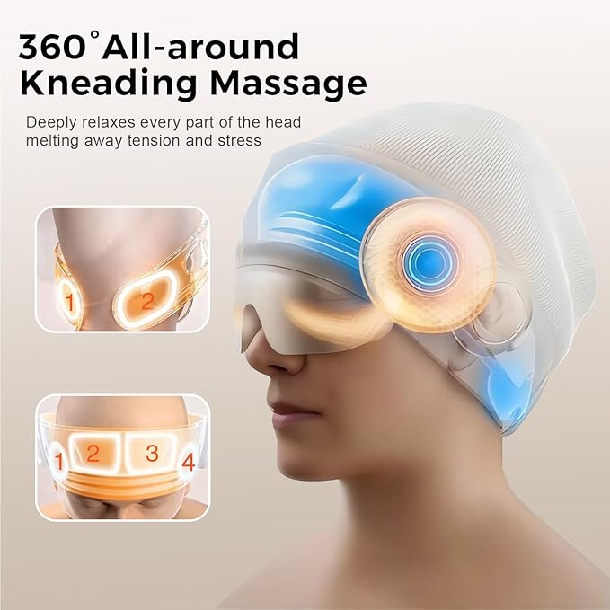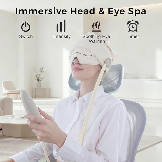 - Full-Head Relaxation with Customizable Massage: Experience a professional-grade head and eye massage with the innovative wrap-around design that targets key zone across your head. Choose from 4 massage modes and 3 intensity levels to enjoy anything from gentle soothing to deep kneading—perfect for easing feelings of tightness and daily stress.