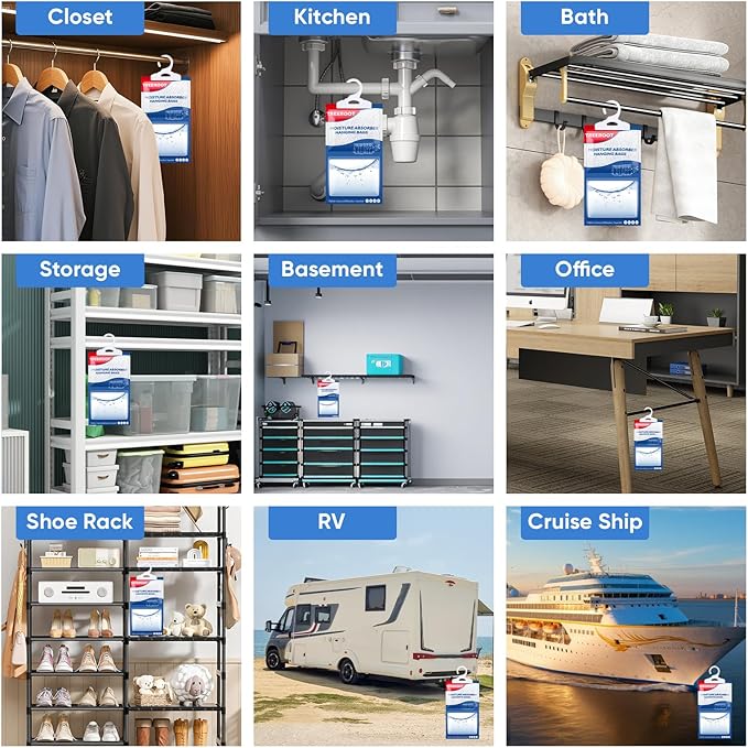 - 【Versatile & Convenient】The sturdy hook design can be hung up for use. You need to remove the moisture absorbent from the outer transparent plastic bag and hang it wherever it needs to absorb moisture. Widely suitable for small to medium enclosed spaces such as wardrobes, bathrooms, car interiors, basements, and kitchens, effectively solving moisture problems in damp corners.