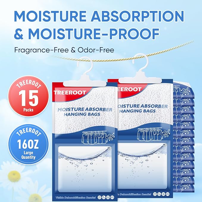 - 【Efficient & Long-Lasting Moisture Absorption】Say goodbye to dampness! TREEROOT Moisture Absorbers - 15 packs bring lasting dryness and freshness to your living space. Made with high-purity spherical calcium chloride, they offer a large moisture-absorbing area and fast absorption speed! Effectively protect your clothes and belongings from moisture damage. Please use continuously for at least two weeks or more.