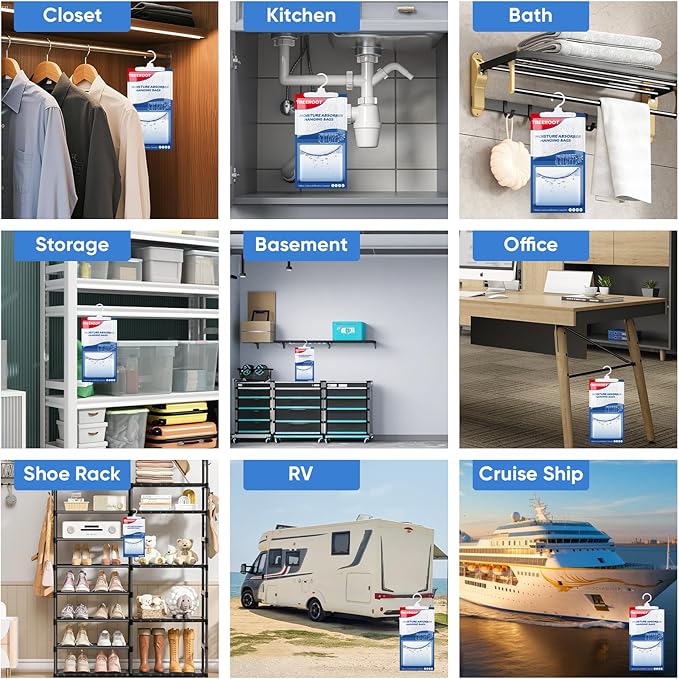 - 【Versatile & Convenient】The sturdy hook design can be hung up for use. You need to remove the moisture absorbent from the outer transparent plastic bag and hang it wherever it needs to absorb moisture. Widely suitable for small to medium enclosed spaces such as wardrobes, bathrooms, car interiors, basements, and kitchens, effectively solving moisture problems in damp corners.