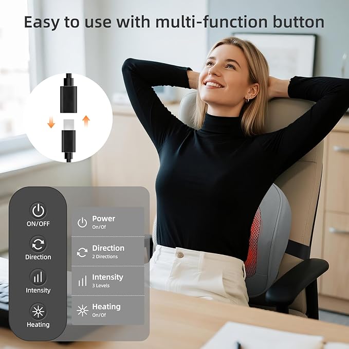 - 【Infrared Heat with Smart Timer】Soothing infrared warmth closely matches body temperature, helping muscles relax and improving blood flow. The built-in 15-minute smart auto shut-off and overheat protection keep this neck massager with heat safe for daily use, easing neck and back pain while supporting faster recovery.
