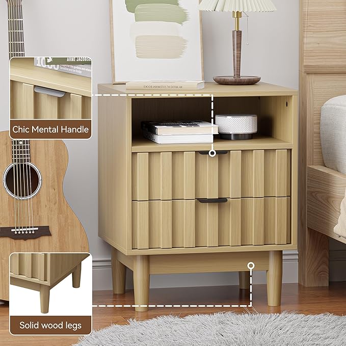 Fluted Nightstand with 2 Drawers, 19" Wide Night Stand with Solid Wood Legs, Open Storage Shelf, Mid Century Modern Wooden Bedside Table for Bedroom, Bed End Side Table, Oak