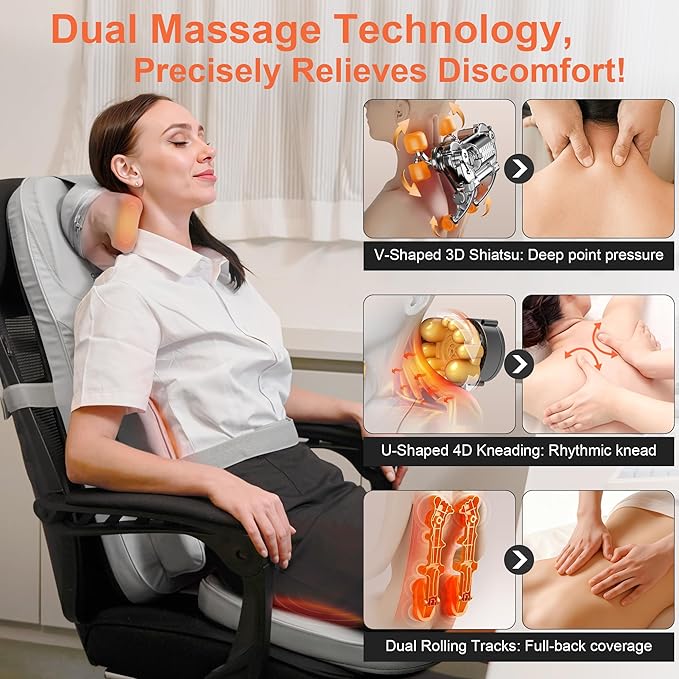 - Deep Kneading Relief: 3D acupressure massage and 4D rolling technology. The 3D V-shaped and 4D U-shaped neck massagers target the neck and shoulders, while the 4D rollers eliminate fatigue across the entire back. It mimics the pressure and movements of a professional massage therapist to relieve soreness in deep muscle tissue