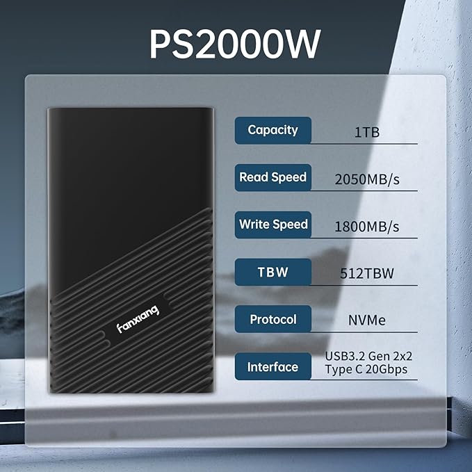 fanxiang 1TB External SSD, Portable Solid State External Hard Drive USB 3.2 Gen2x2, Up to 2000MB/s, USB-C External Storage for iPhone 15/Pro, PC, Laptop, Creators,Gaming Console - PS2000W