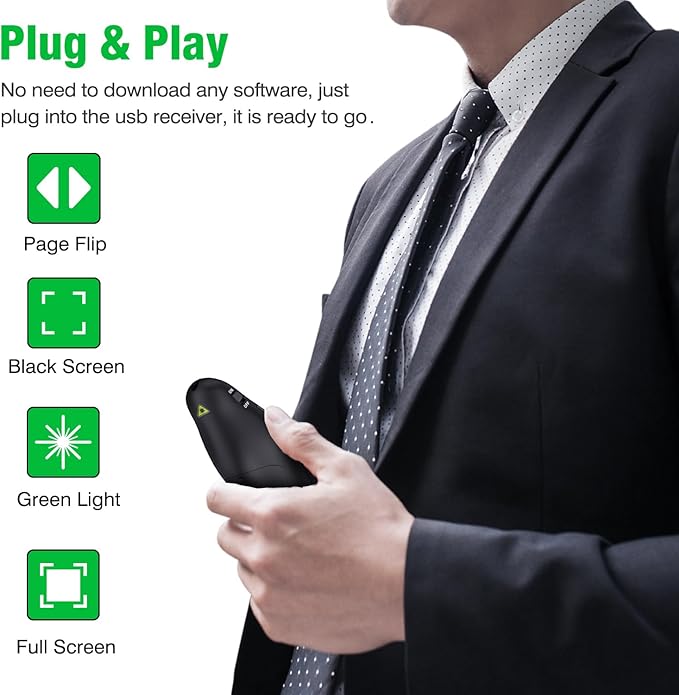 - 【Plug & Play Green Presentation Remote】Simply plug the USB receiver into your laptop or computer—no software or drivers needed. The green light delivers sharper clarity and effortlessly captures your audience's attention. 2.4GHz wireless connection offers a control range of up to 115 feet, allowing you to move freely around the room while advancing slides.