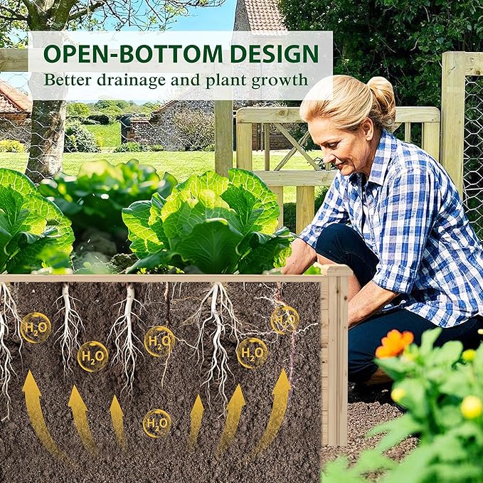 - Flexible and Multifunctional Design: This raised garden beds outdoor are separated into two growing areas for different plants or planting methods. The baffle can be removed to form a bigger growing area. Our raised garden bed can be flexibly adjusted to meet various planting needs. In addition, the structure of the planting bed includes an open-bottom and stable side panels. The open-bottom structure accelerates drainage and ventilation, facilitating the healthy growth of plant roots. The side panels are firmly spliced, without shaking, effectively preventing soil leakage