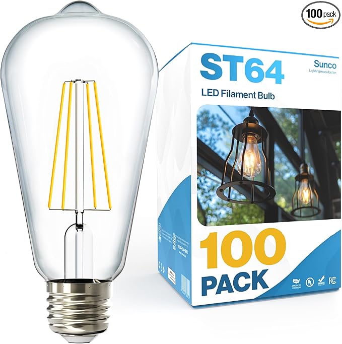 Sunco 100 Pack Edison Bulbs LED ST64, Clear Vintage Filament Waterproof Bulb, 800 LM, 8W (60W Equivalent), ST19, 3000K Warm White, E26 Medium Base, Decorative Dimmable UL