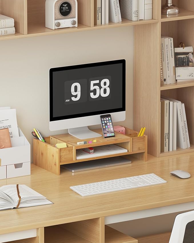 - STURDY BAMBOO MATERIAL: Crafted from premium bamboo, this monitor riser is sturdy and durable, fine polished with a smooth touch, and the natural color gives a clean, tidy feeling also blends with any home décor