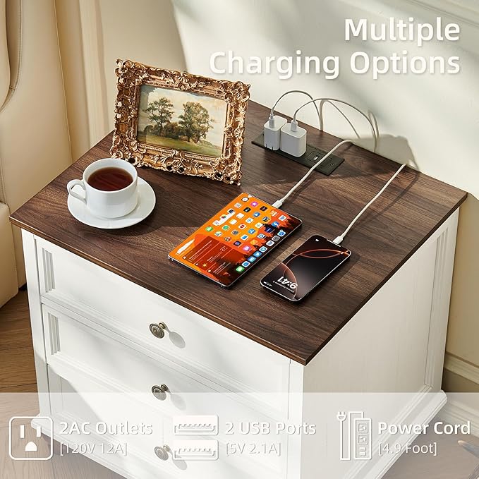 Farmhouse Nightstand Set of 2 with Charging Station, 24" Wide End Table with 3 Drawers,Dresser for Bedroom,Bed Side Table Chest of Drawers Cabinet,Wood White Night Stand for Living Room