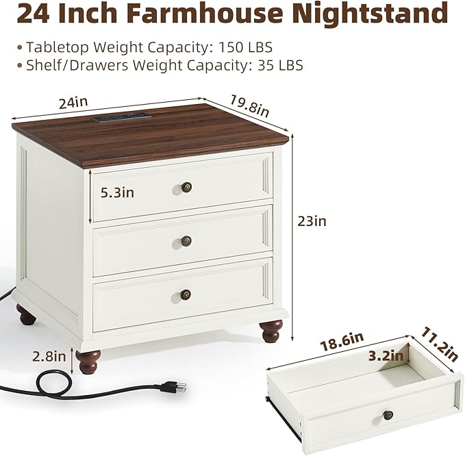 Farmhouse Nightstand with Charging Station, 24" Wide End Table with 3 Drawers,White Wood Dresser for Bedroom, Bed Side Table Chest of Drawers Cabinet,Night Stand for Living Room, Closet