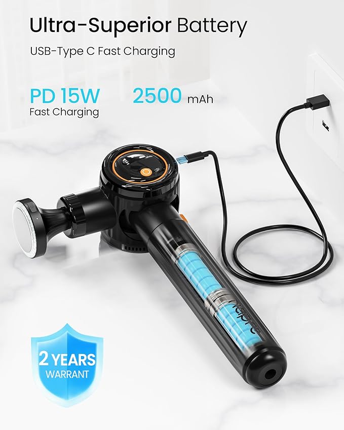 - 【15W PD Fast Charging & USB Type-C Charging】This handheld massage gun supports 15W PD fast charging—it fully charges in just 2.5 hours, compared to 4+ hours for conventional models. The long-life rechargeable battery supports continuous use for over 3+ hours on a single charge. This back massage gun also features auto-shutoff and overheating protection for safe and portable operation.