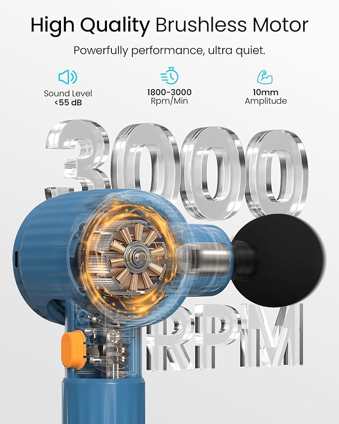 - 【Powerful Performance & Ultra-Quiet Design】The percussion massage gun is equipped with a high-quality brushless motor that delivers powerful percussion (1800–3000 RPM variable speeds, 10mm amplitude), with noise below 55dB (as quiet as a library). Enjoy deep, peaceful therapy at home, the gym, or the office without worrying about disturbing others.