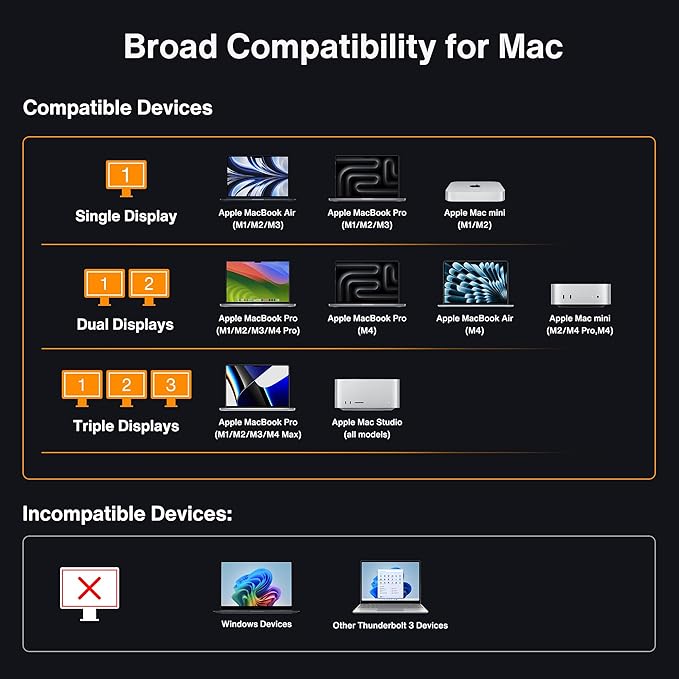 - 【Triple Displays Up to 6K@60Hz】Only the Mac series with M1/M2/M3/M4 Max chips supports Triple extended displays(Dual 6K@60Hz+Single 4K@60Hz). The Mac series with M4 or M1/M2/M3/M4 Pro chips only supports dual 6K@60Hz displays. The 2020/2022 Mac series with M1/M2/M3 chips only supports a single 6K@60Hz extended display