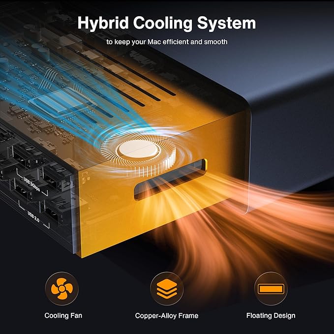 - 【Hybrid Cooling System】This docking station features a multi-layer heat dissipation design, with an internal copper plate for efficient heat dissipation, an elevated structure to promote airflow, and a built-in fan for continuous cooling. These elements work together to ensure stable performance for your devices during extended use