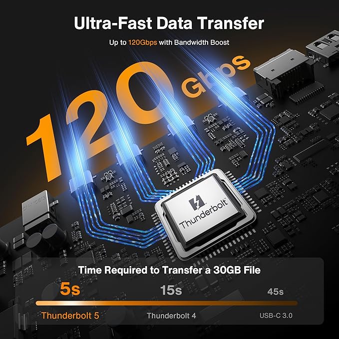- 【120Gbpsbps Data Transfer】Thanks to the 3*120Gbps Thunderbolt 5 ports, you can upstream and downstream any data in a flash. Equipped with 10*USB ports, which can support up to 10Gbps data transfer and allow you connect enough external equipment