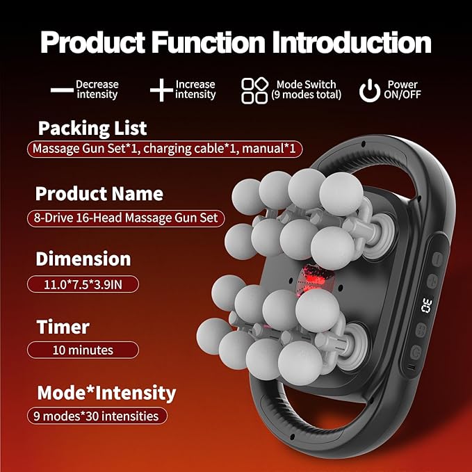 - Our 16-head massage gun features a triple protection safety design (charging protection + overload protection + automatic shutdown) to ensure user safety and peace of mind during use. The 10-minute automatic shutdown function prevents excessive use, ensures reliable operation, and protects the device to maintain long-term performance.