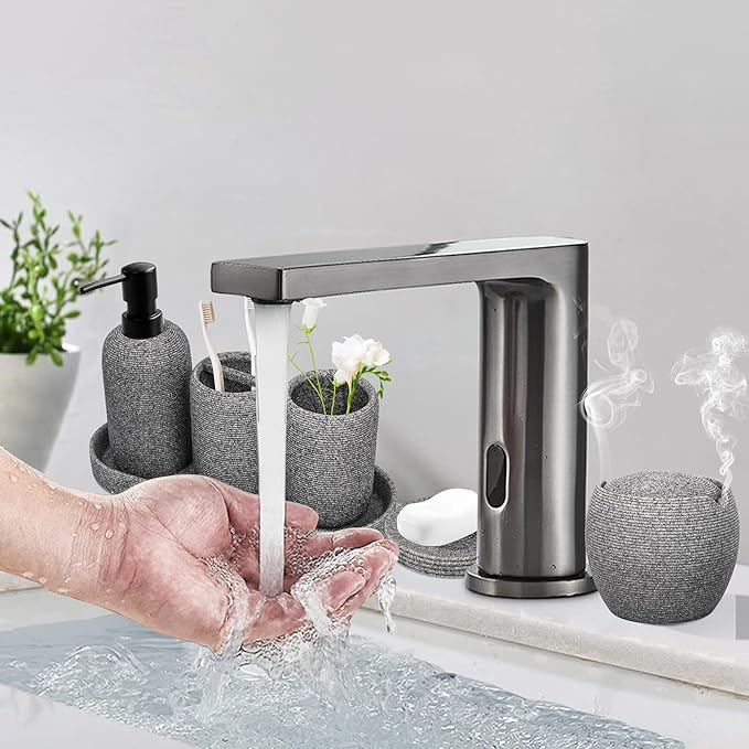 - Complete 6-Piece Bathroom Set - Includes essential items: soap dish, lotion dispenser, toothbrush holder, mouthwash cup, tray, and cotton ball jar.