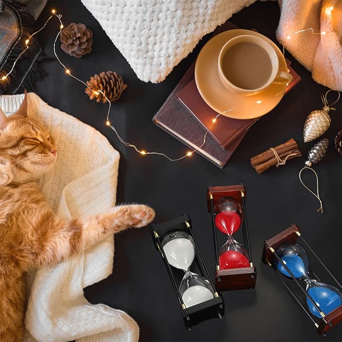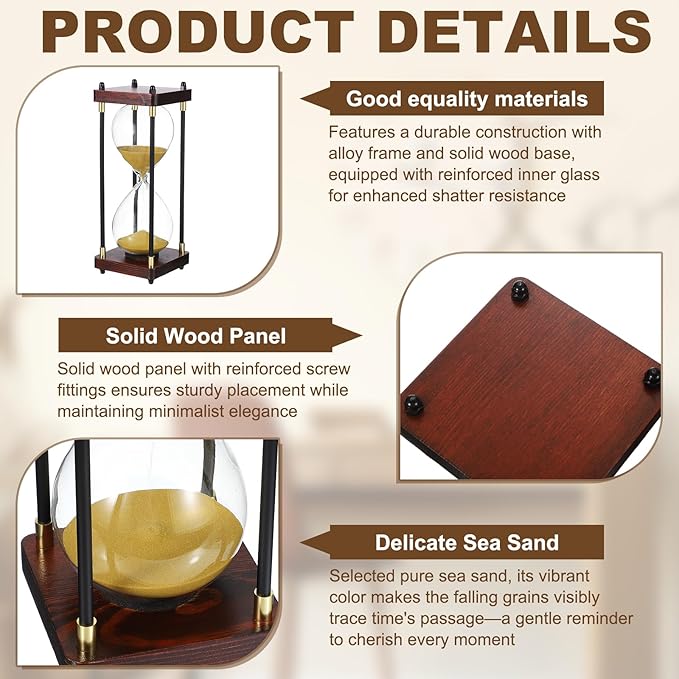 - Advantage: This frame decorative sand timer features a durable construction with a good quality alloy frame and solid wood base, equipped with reinforced inner glass for enhanced shatter resistance. Its classic design blends with both modern and vintage decor styles, making it suitable for various settings, including homes, kitchens, cafes, and offices. Unlike digital timers that strain your eyes, this sand timer offers a more focused way to track time.