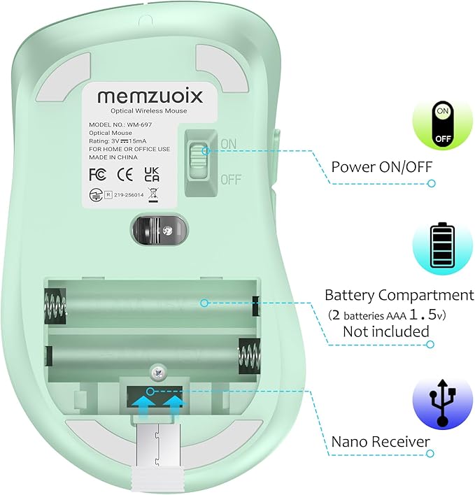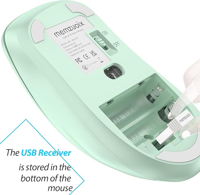 - Energy Saving Design: Before using it, please remove the USB receiver(inside the battery compartment) and then install 2*AAA Dry Batteries(Not Included)!! The 'On/Off' switch design solves the trouble of changing battery frequently. Besides,mouse for computer wireless will turn to sleep mode in 7mins of inactivity for energy saving, can be easily activated by clicking any buttons.