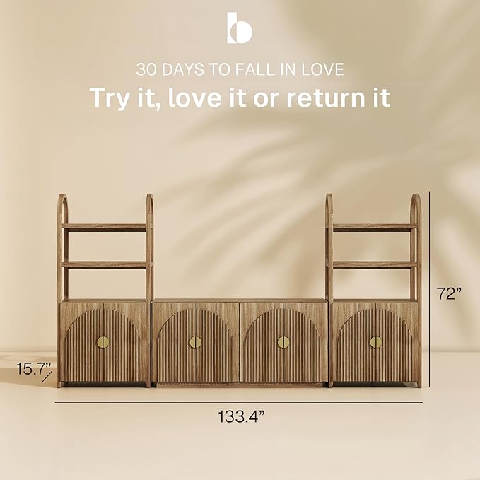 BELLEZE 3-Piece Arched TV Stand Entertainment Center with Storage, Mid Century Modern 2-Piece 72″ Tall Storage Cabinets and 65″ Fluted TV Console for Living Room(Caramel Brown)