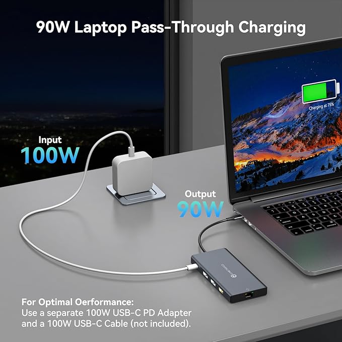 - 100W PD Power Delivery for Your Laptop: Note: Power Adapter not included. Using a compatible 100W USB-C PD power supply, this dock can charge your connected devices and simultaneously deliver up to 100W of power to your laptop, providing lasting power even under heavy loads