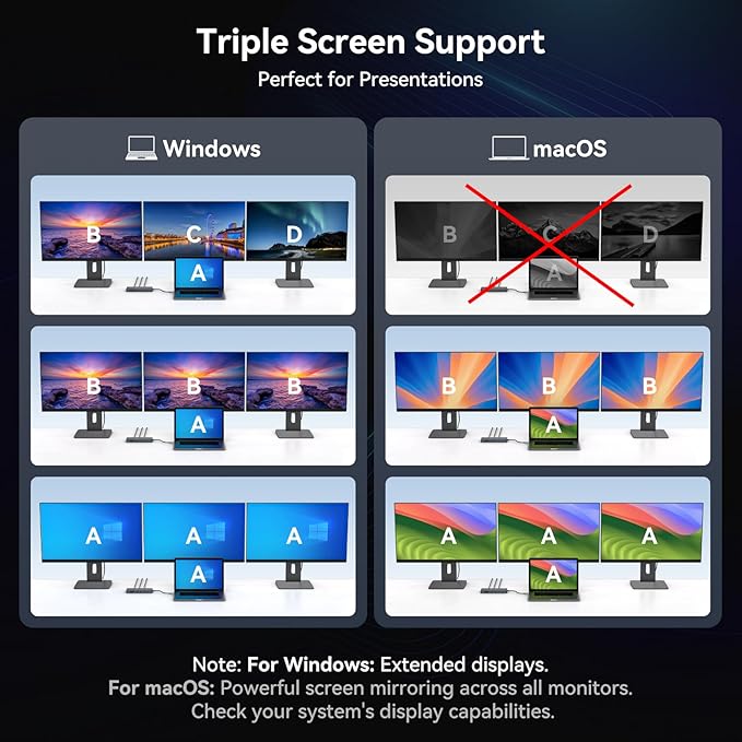 - Compatibility Note (Please Read!): Full functionality (three independent images) requires a Windows/Linux laptop with Thunderbolt 4 (or later). For MacBook/Mac devices: Only mirror mode is supported. This means all three connected monitors will display the same image