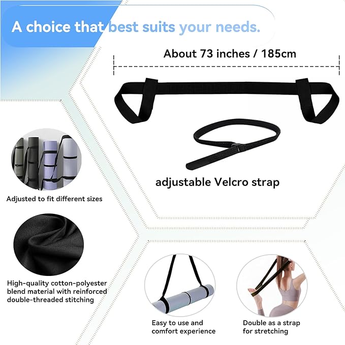 - 【EXTRA-LONG AND FULLY ADJUSTABLE】At 73 inches long with a secure hook-and-loop closure, it easily fits all standard, thick, and extra-long yoga mats. Adjust in seconds for a perfect, secure fit.