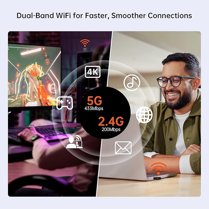 - ๐๐๐ -๐ ๐ซ๐๐ ๐๐ฎ๐๐ฅ ๐๐๐ง๐ ๐๐จ๐ง๐ง๐๐๐ญ๐ข๐จ๐ง -Get WiFi speeds up to 200Mbps on 2.4 GHz band and up to 433Mbps on 5GHz band which much more faster than other N150 USB WiFi adapter on the market. With these upgraded speeds, web surfing, gaming, and streaming online is much more enjoyable without buffering or interruptions