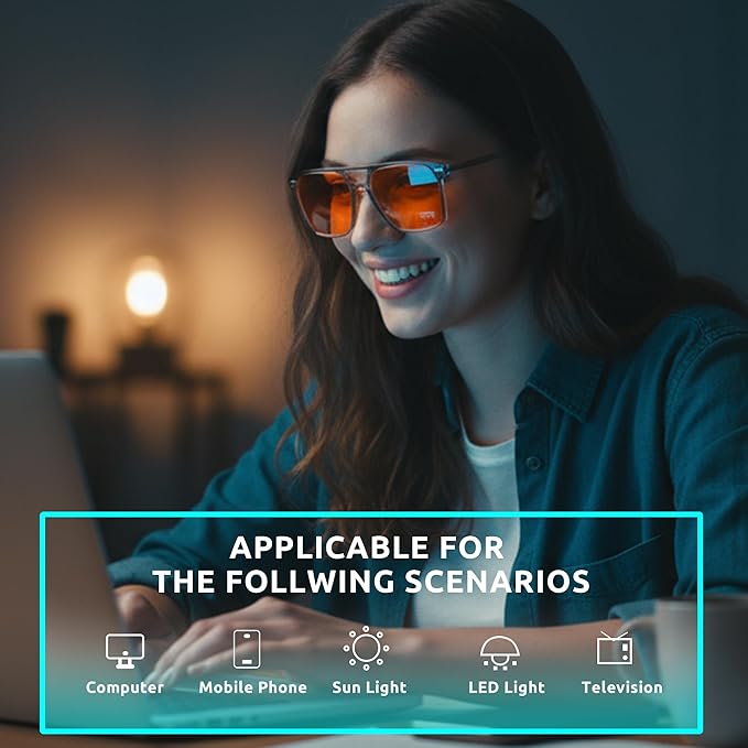 - 【Enhance Sleep Quality】When using electronic devices at night, blue light interferes with melatonin secretion and affects sleep. Wearing our orange blue light glasses helps you naturally regulate your biological clock and promotes healthy sleep habits, so you can enjoy a better quality of rest every night.
