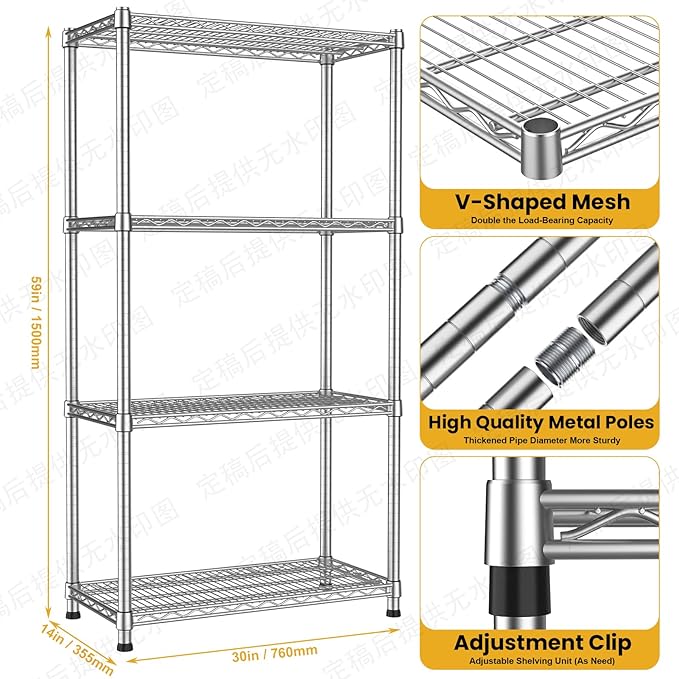 - 【Superior Chrome-Plated Carbon Steel Build】4-Shelf Net Weight: about 29 lbs, Constructed from high-quality Q235 carbon steel with a durable chrome finish, this shelving unit resists rust and corrosion, ensuring long - lasting use. With a tube diameter of 25.4MM and a thickness of 1.2MM, along with a dense wire mesh (6.0MM main lines, 3.0MM surface lines, 4.5MM wavy lines, 17MM surface line spacing), it offers robust stability for heavy loads